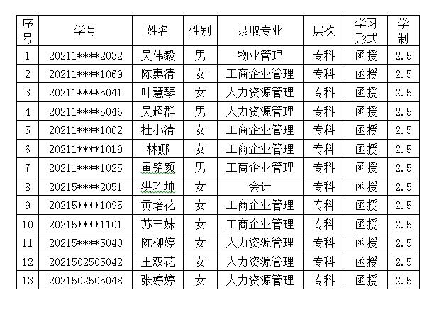 根据《kaiyun中国官方网站成人高等学历教育学籍管理办法》(闽商院文〔2019〕60号)第二条规定,我校成人教育2021级吴伟毅等13名同学逾期未办理报到入学手续,经研究决定,取消吴伟毅等13名同学入学资格。具体名单如下: