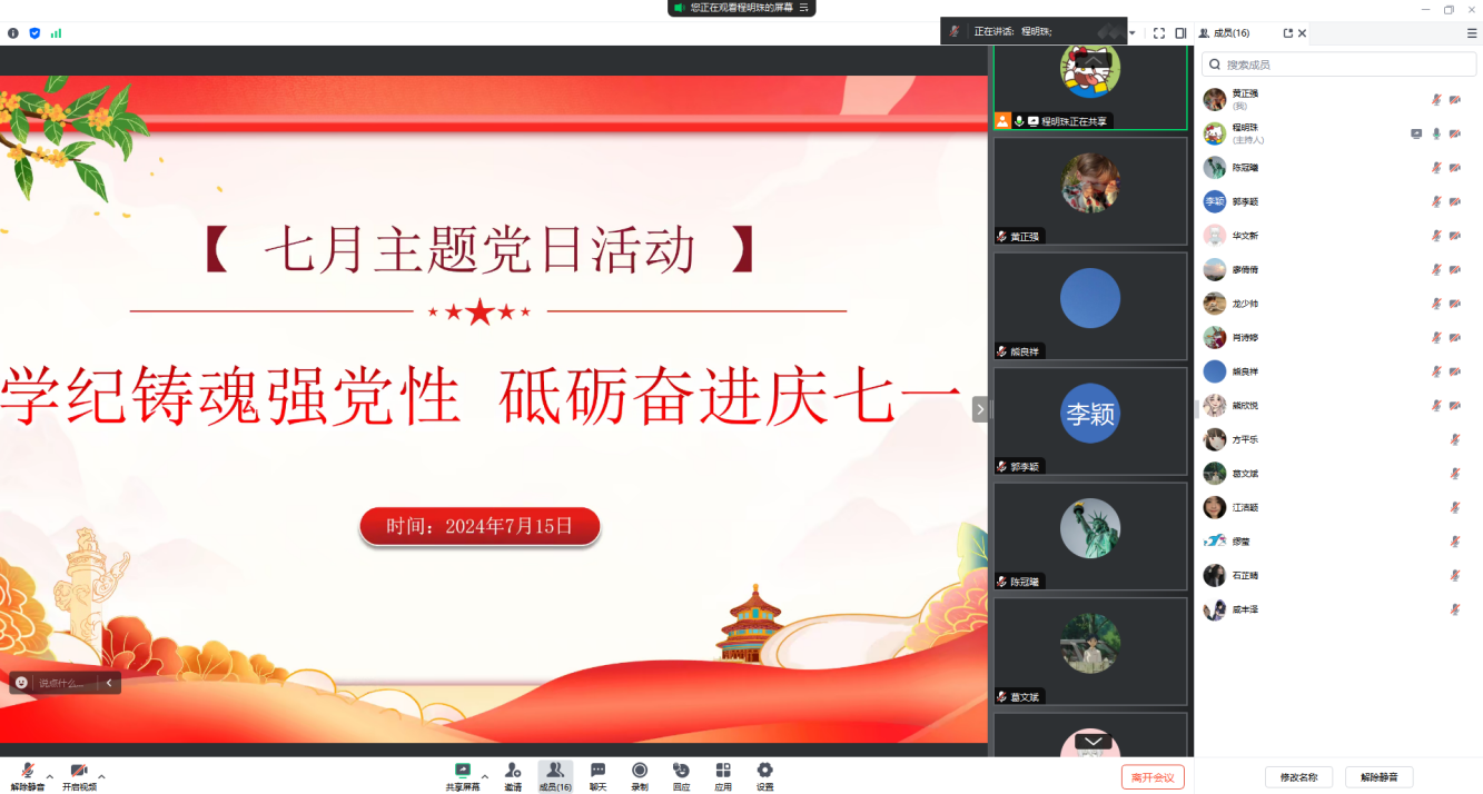 为庆祝中国共产党成立103周年,弘扬伟大建党精神,贯彻落实新时代党的建设总要求,进一步健全全面从严治党体系推动党纪学习教育走深走实,beat365英国官方网站第二党支部于7月15日召开线上会议,开展了“学纪铸魂强党性 砥砺奋进庆七一”主题党日活动。