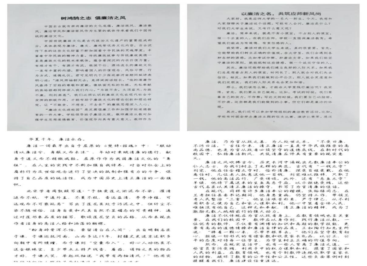 随着活动的正式开始,一股清新的廉洁之风悄然在校园里弥漫开来。各团支部积极响应,迅速行动起来,将此次征文比赛作为加强新时代廉洁文化建设的重要契机,精心组织,广泛宣传。同学们热情高涨,用文字抒发对廉洁文化的理解和感悟、描绘心中清廉校园的蓝图。同学们围绕“弘扬廉洁新风,共筑清廉应师”的主题,以诗歌、散文、随笔、信件等多种形式,表达了对廉洁政风、廉洁教风、廉洁学风和廉洁家风的坚定信仰。他们的字里行间充满了对廉洁文化的热爱和追求,展现了当代大学生的高尚情操和良好风貌。在创作过程中,他们用心构思,精心打磨,力求让每一篇作品都成为廉洁文化的精品,让每一篇作品都凝聚着他们的心血和智慧。活动最后,吴豪、孙晓坚、邱胜同学分别获得了比赛的一等奖、二等奖和三等奖,李维杰、陈敬优、徐凡、邓意、叶涛、李宗萌、程炀坤七名同学获得了此次比赛的优秀奖。