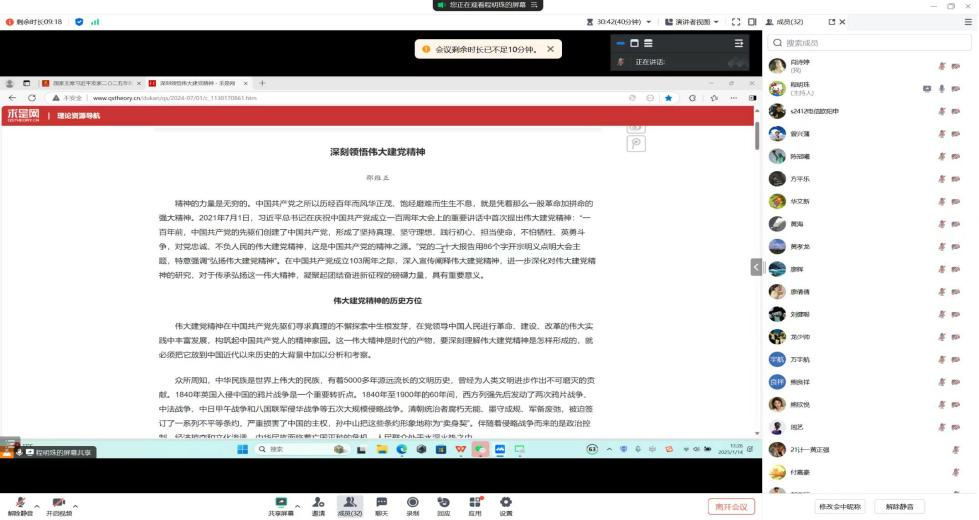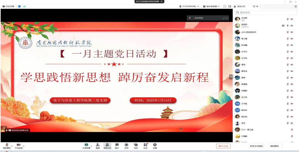 为持续深入学习贯彻习近平新时代中国特色社会主义思想,弘扬伟大建党精神,使全体党员更加自觉地学习党章、遵守党章、贯彻党章、维护党章,beat365英国官方网站第二党支部于2025年1月14日,在腾讯会议组织召开了“学思践悟新思想 踔厉奋发启新程”主题党日活动。支部全体党员参加了此次会议,会议由党支部书记程明珠主持。
