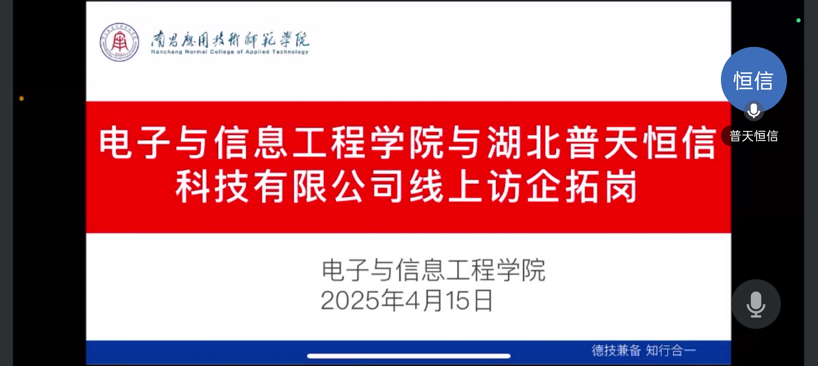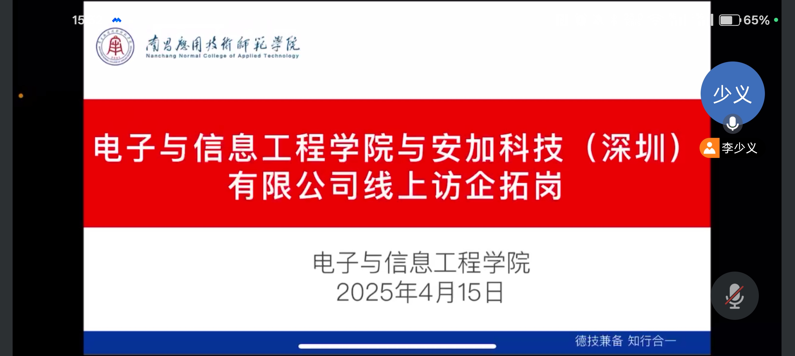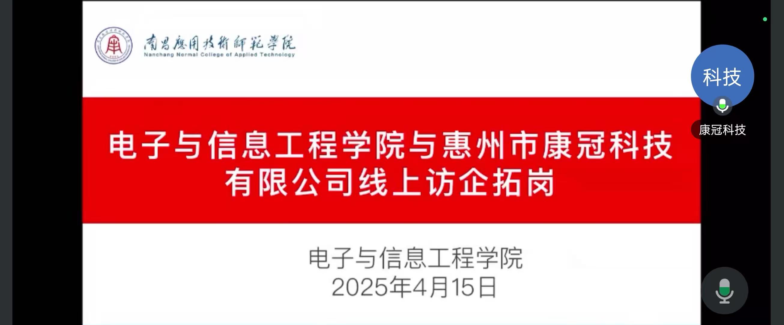 为深化校企合作,拓宽学生就业渠道,提升人才培养质量,4月15日下午,beat365英国官方网站邀请惠州市康冠科技有限公司、安加科技(深圳)有限公司、湖北普天恒信科技有限公司、广州千智信息科技有限公司等多家公司开展线上访企拓岗行动,学院党总支书记江建华及校长助理李少义出席会议,会议由就业专员曾思雨主持。