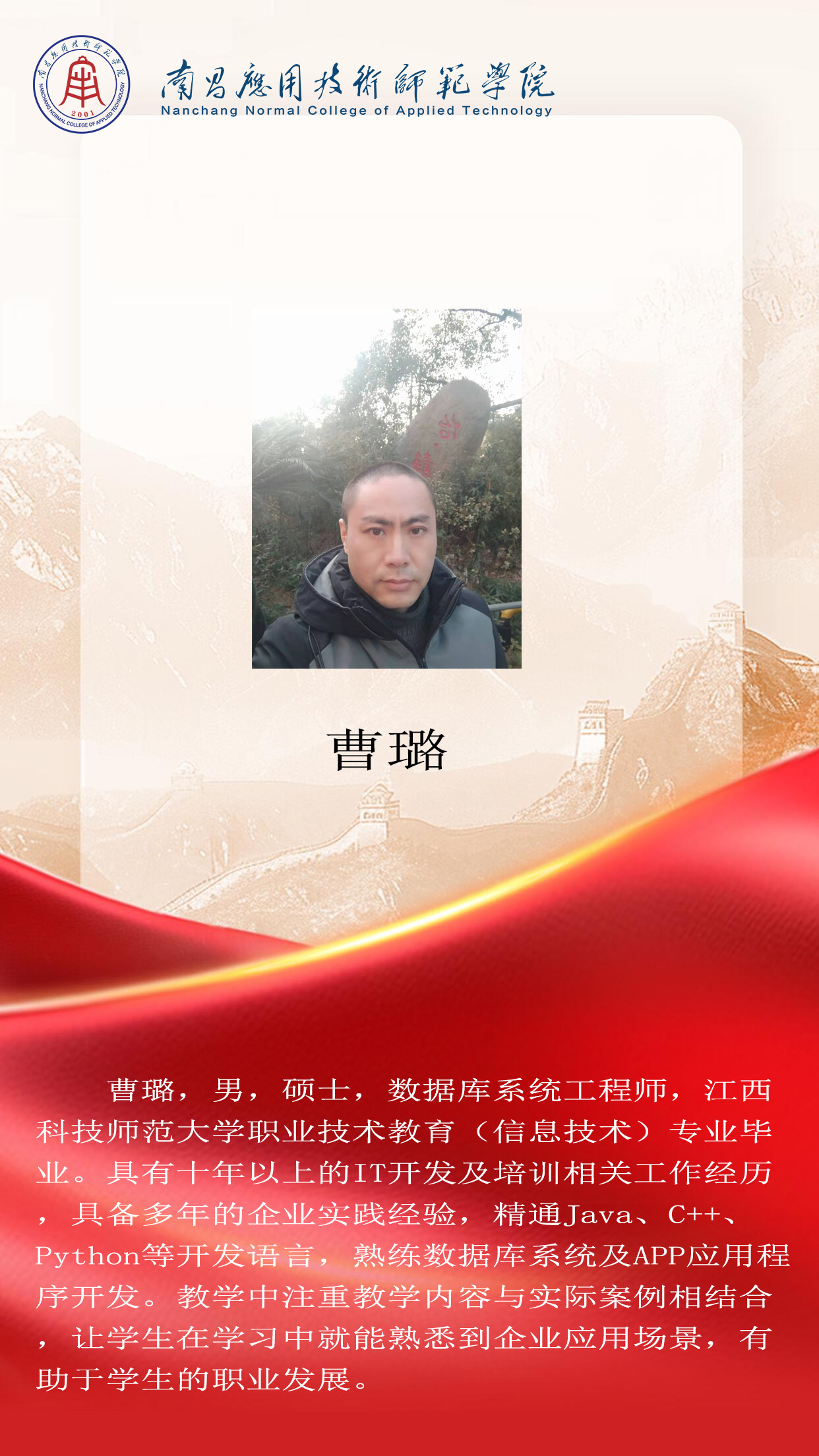 先进典型 优秀毕业生 优秀学生风采 优秀教职工 您现在的位置是:首页 > 先进典型 > 优秀教职工 曹璐 计算机系主任 管理员2025-06-161292 上一篇 曹海 副教授 下一篇 张扬 工程技术系主任