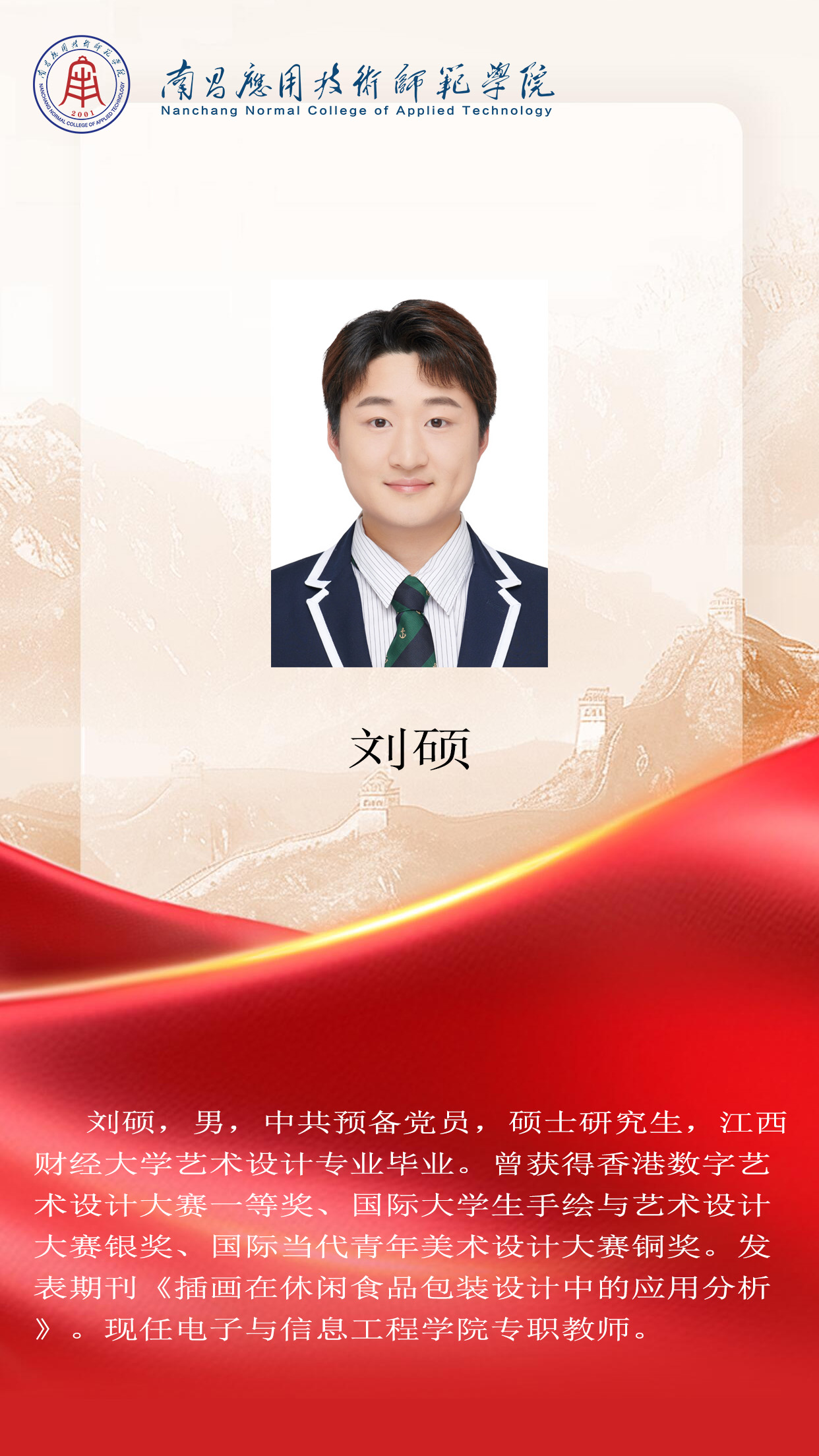 先进典型 优秀毕业生 优秀学生风采 优秀教职工 您现在的位置是:首页 > 先进典型 > 优秀教职工 刘硕 数字媒体系主任 管理员2025-06-161314 上一篇 刘军 副教授 下一篇 张扬 工程技术系主任