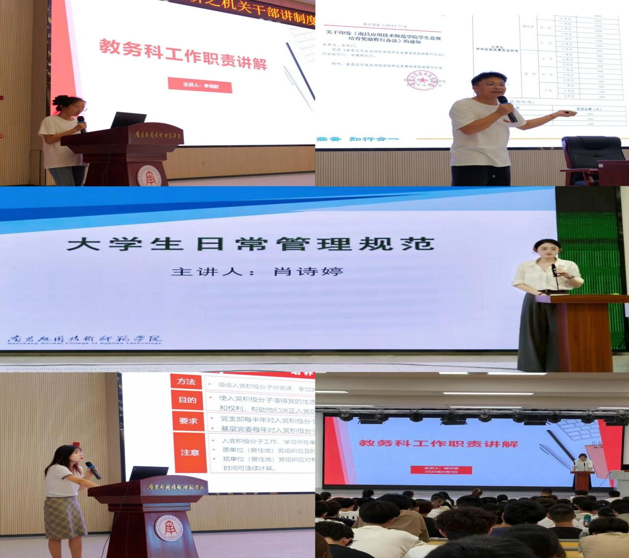 学工科肖诗婷解读了校纪校规、安全教育、奖助贷勤政策等,介绍了学院管理模式与心理健康教育工作,全方位指导新生适应大学生活;教务科潘洪雪详细讲解了从入学报到至毕业全过程的学业安排,指导新生转变学习方式、适应大学教学模式;院团委龙少帅展示了涵盖思想政治、学科竞赛、志愿公益等领域的社团活动,号召新生积极参与,丰富校园生活;组织员程明珠通过清晰的图示,分步拆解从申请入党到成为正式党员的流程,鼓励同学们积极向党组织靠拢。