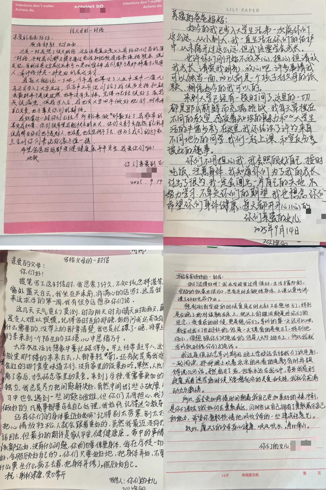 为引导学生在快节奏的数字时代重拾笔墨温情,深化自我认知、感恩意识与情感联结,beat365官网精心策划并举办了 “写给父母的一封信”“写给自己的一封信”“写给重要的人的一封信” 三合一主题书信创作活动。活动自启动以来,获得了大部分学生的积极响应,字里行间满含新生对大学的期待、对情感的珍视与对自我的期许,成为学院助力新生适应校园生活的温暖注脚。
