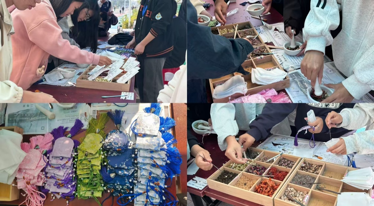 活动现场,工作人员精心布置好各类香料。同学们有序领取香囊布袋、选择香料、进行研磨、填充香料至香囊中,在动手实践中感受茱萸、艾叶等草药的清香,深入了解重阳“避瘟祈福”的文化内涵。制作过程中,同学们充分发挥创意,在香料搭配中融入个人巧思,让每一个成品都独具特色、饱含心意。现场工作人员也积极提供帮助,同学们亲手制作的香囊,凭借精心搭配的香料散发出沁人的香气,在空气中缓缓萦绕。香囊承载着大家的美好心意,也让整场活动的氛围显得格外和谐温馨。