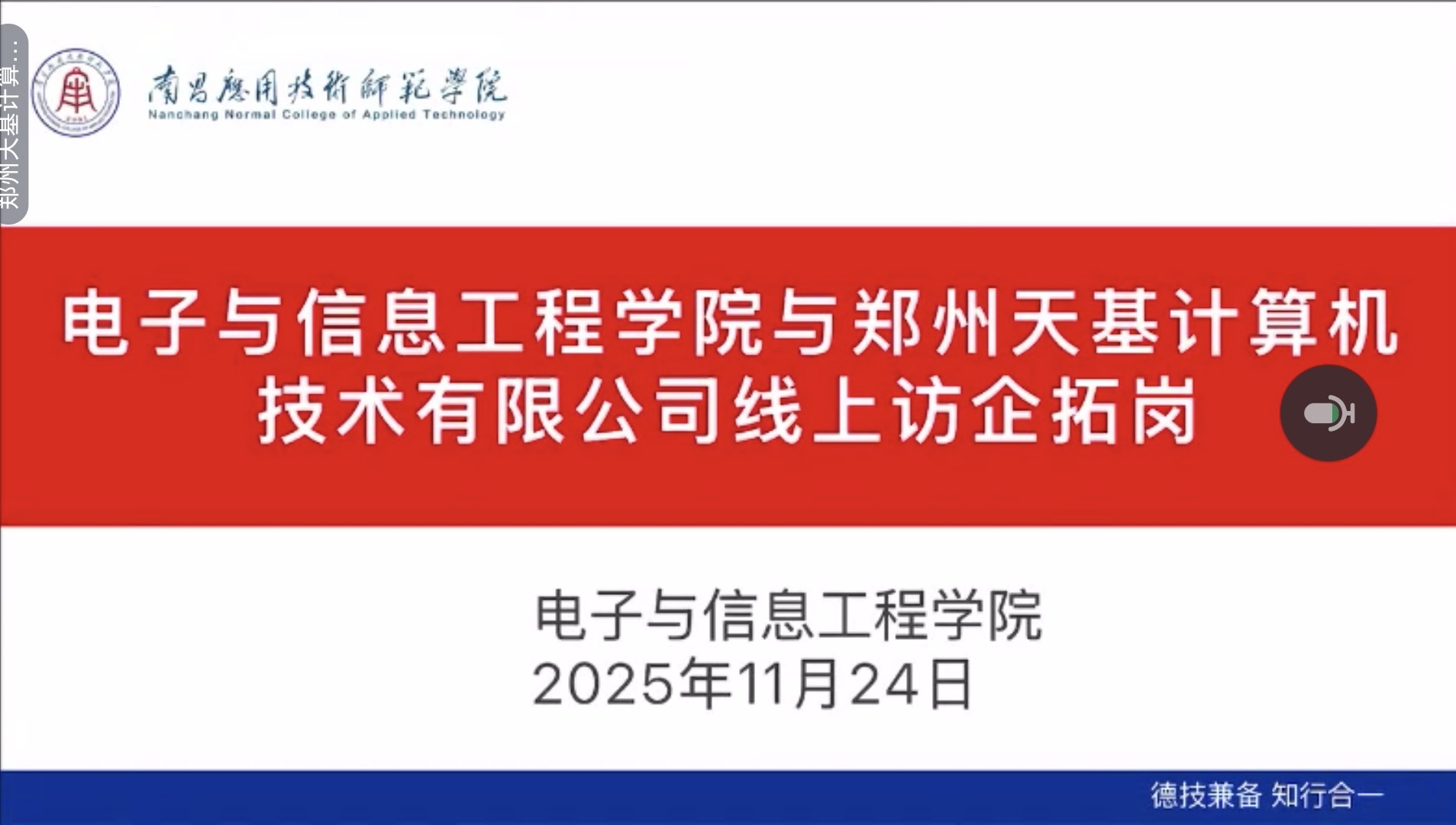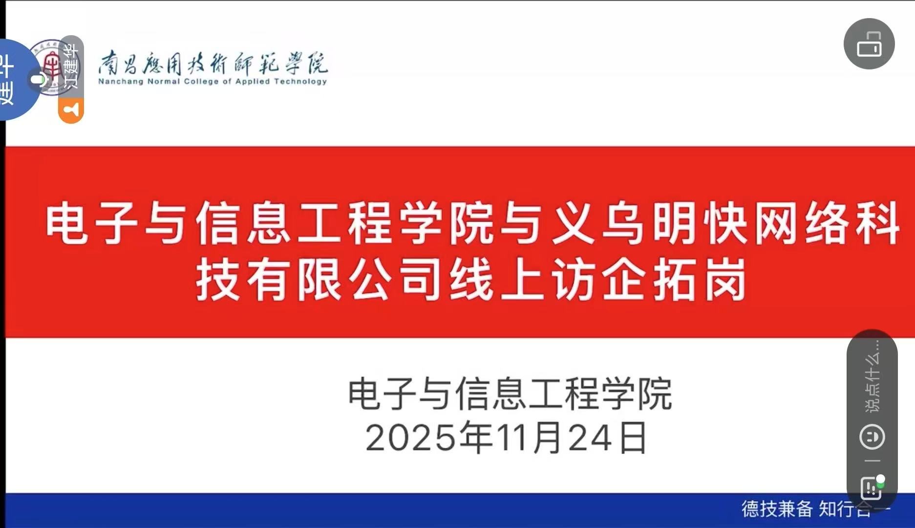 为贯彻落实国家关于高校毕业生就业工作的决策部署,进一步加强与企业的沟通与合作,拓宽毕业生就业渠道,我院成功于2025年11月24日与郑州天基计算机技术有限公司、义乌市迎乐软件科技有限公司、义乌明快网络科技有限公司、赣州零帧起网络科技有限公司以线上形式开展了访企拓岗专项交流会议。会议由学院就业专员曾思雨老师主持,学院党委书记江建华、各公司负责人共同参会。