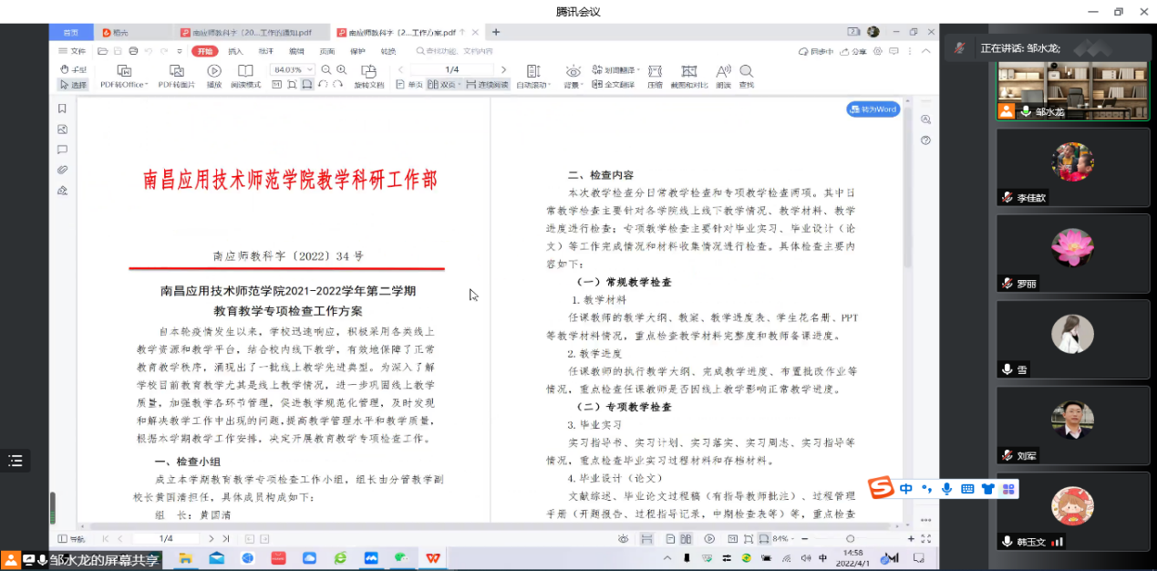 4月1日,beat365英国官方网站利用腾讯会议,线上召开教研室工作会,教务管理人员、教研室主任参加了此次会议,会议由院长邹水龙主持。