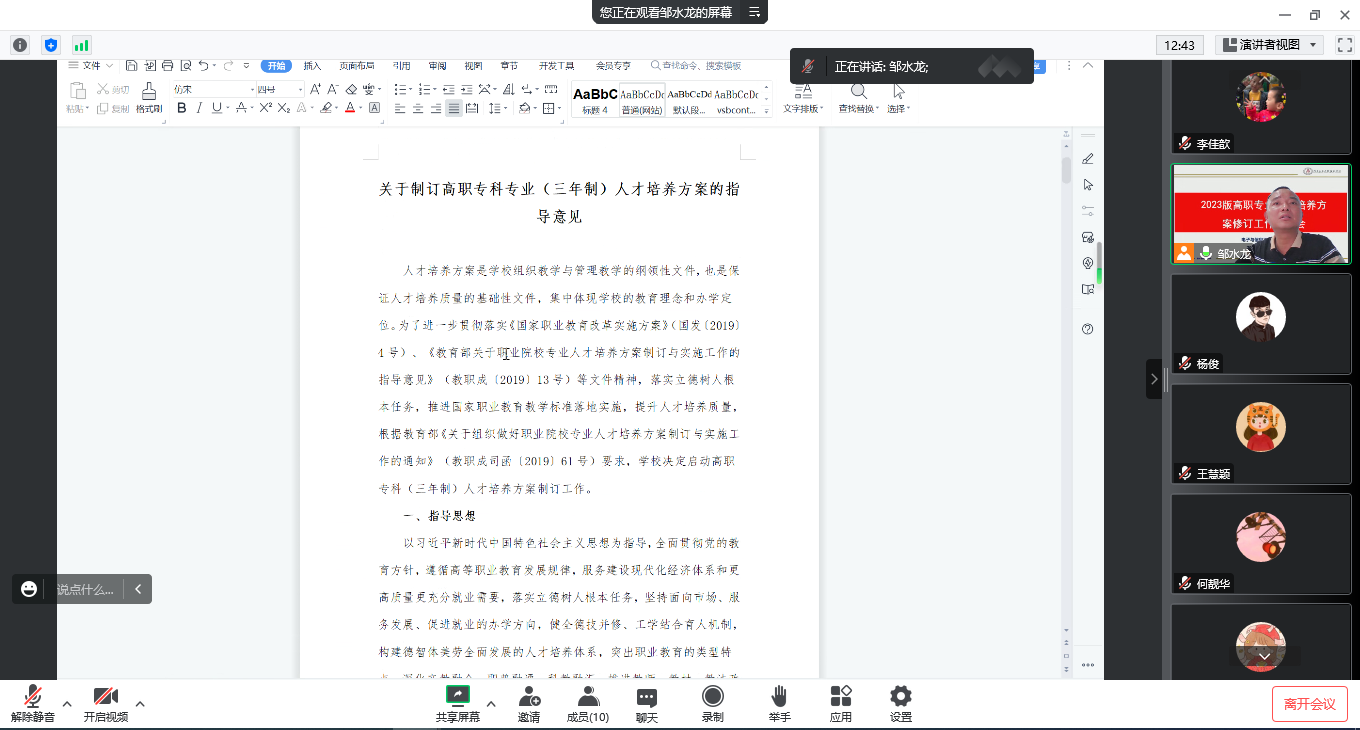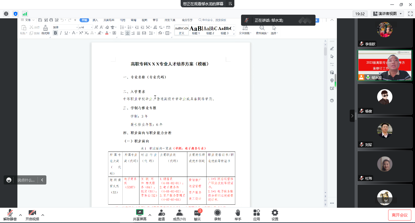 为扎实做好2023版高职专科专业人才培养方案制定工作,5月9日,学院利用腾讯会议,线上召开2023版高职专科专业人才培养方案制定研讨会,学院教务管理人员、各专业负责人参加了此次会议,会议由院长邹水龙主持。