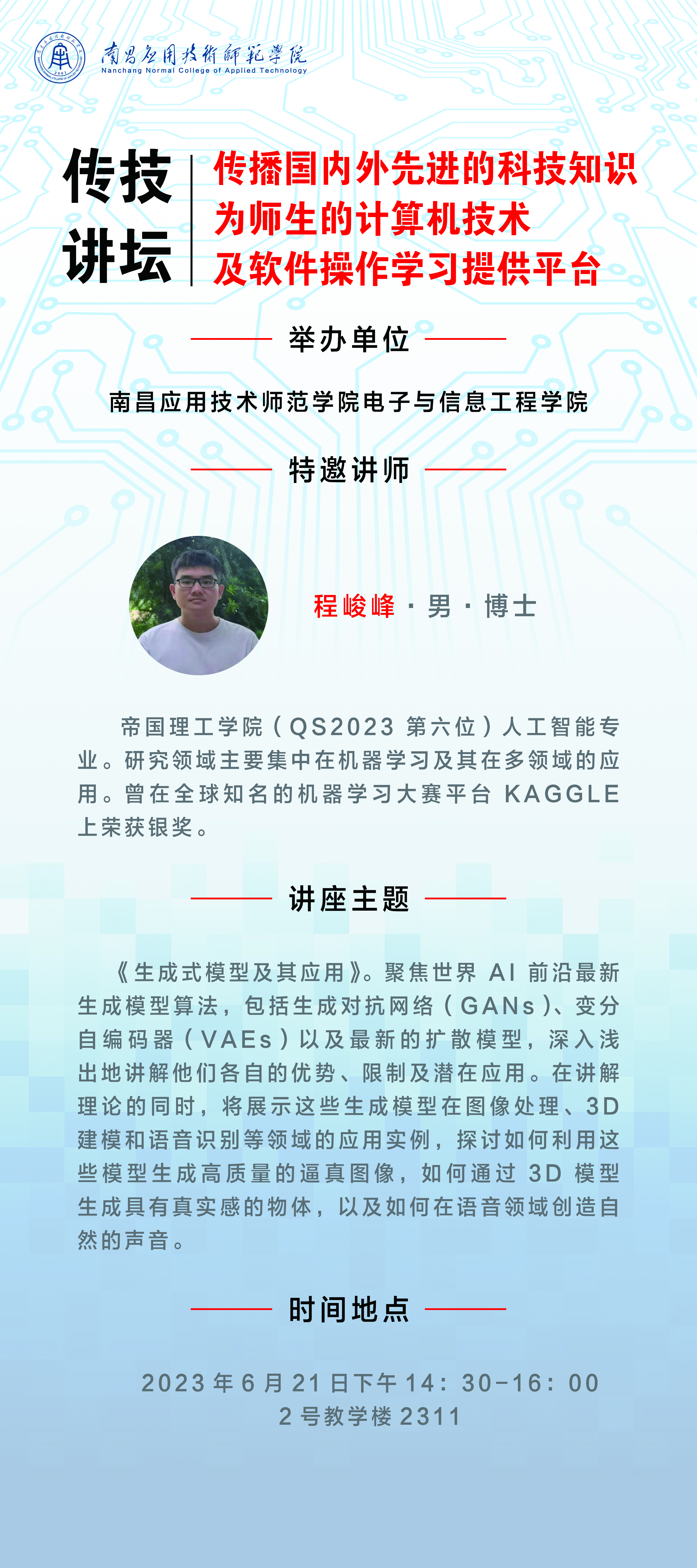 首页栏目 学院新闻 学院公告 学生工作 您现在的位置是:首页 > 首页栏目 > 学院公告 传技讲坛(第2期)——生成式模型及其应用 管理员2023-06-141277 上一篇 关于“双师双能型教师”考核、认定结果的公示 下一篇 电信学院关于评选2025-2026学年第一学期“优秀学生干部”、“优秀工作者”、“文明寝室”、“先进班集体”获奖名单公示