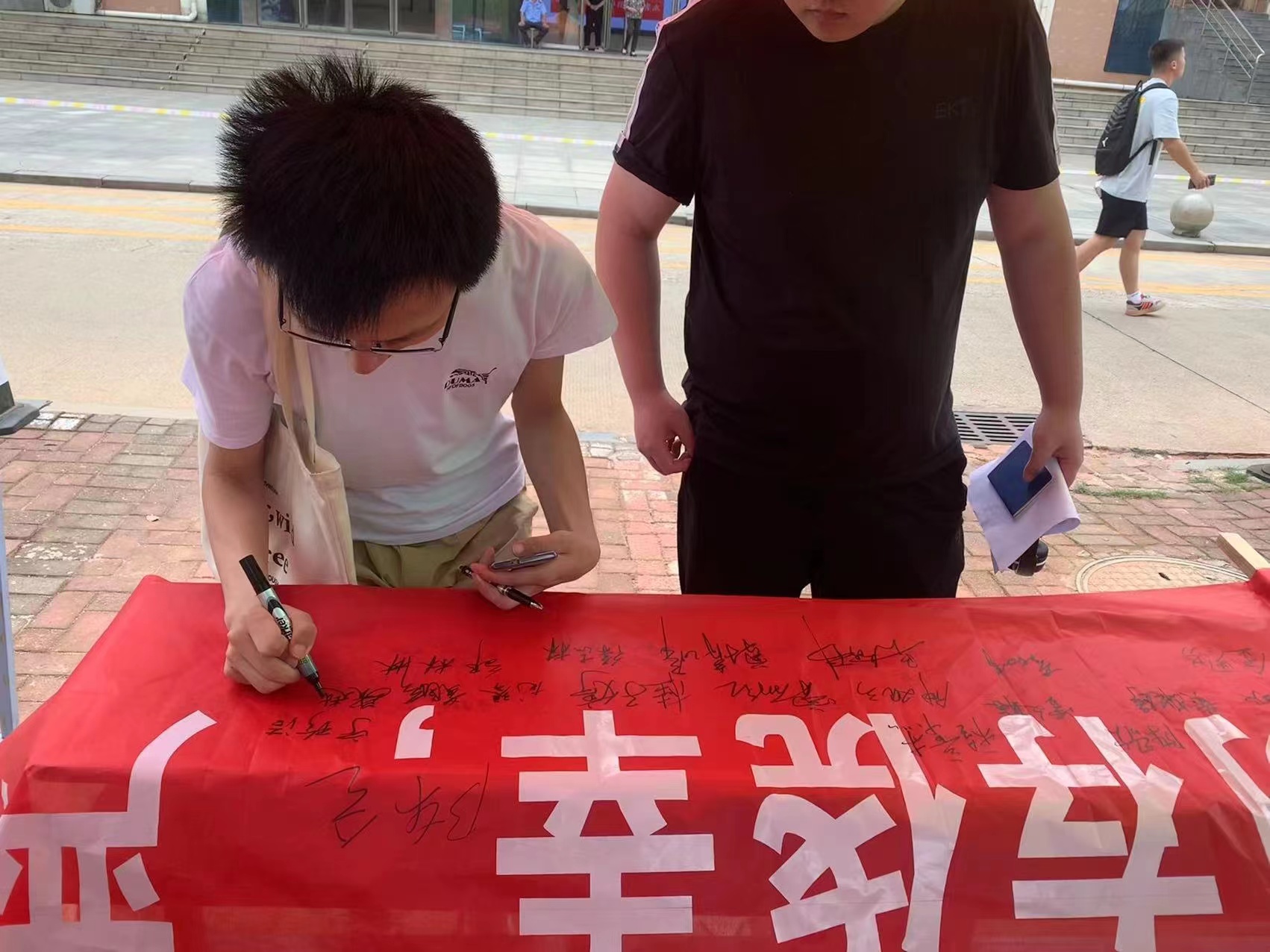 期末考试将近,为树立优良学风,加强考风考纪,营造良好的考试氛围。beat365英国官方网站于6月23日在教学楼门前停车场开展了“勿存侥幸,严禁作弊,诚信考试,从我做起”主题签名活动。