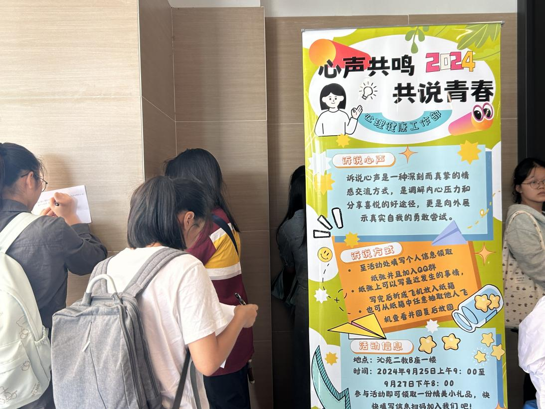 2024年9月25日至9月27日,由心理咨询中心主办、beat365英国官方网站心理健康工作部承办的“心声共鸣,共说青春”心理健康主题活动在沁苑2教B座1楼圆满举办。此次活动旨在鼓励新生勇于诉说上大学以来的心路历程,传递温暖,营造积极向上的校园氛围。