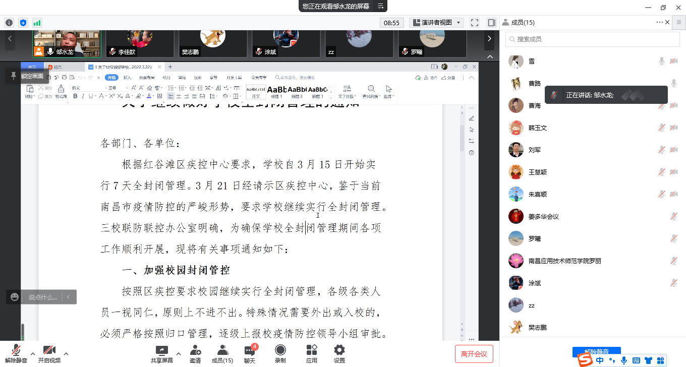 会上,邹水龙全文宣读了学校“关于继续做好学校全封闭管理的通知”,传达了校领导关于疫情防控的相关指示要求,邹水龙强调,疫情就是命令、防控就是责任,全体教师务必提高政治站位,严格按照防控要求,积极配合学校、社区做好疫情防控工作。随后,邹水龙就线上教学、在线教学质量监控、线上教学比赛、目标任务落实、教研活动开展、毕业论文(设计)、毕业实习等工作进行了详细布置。