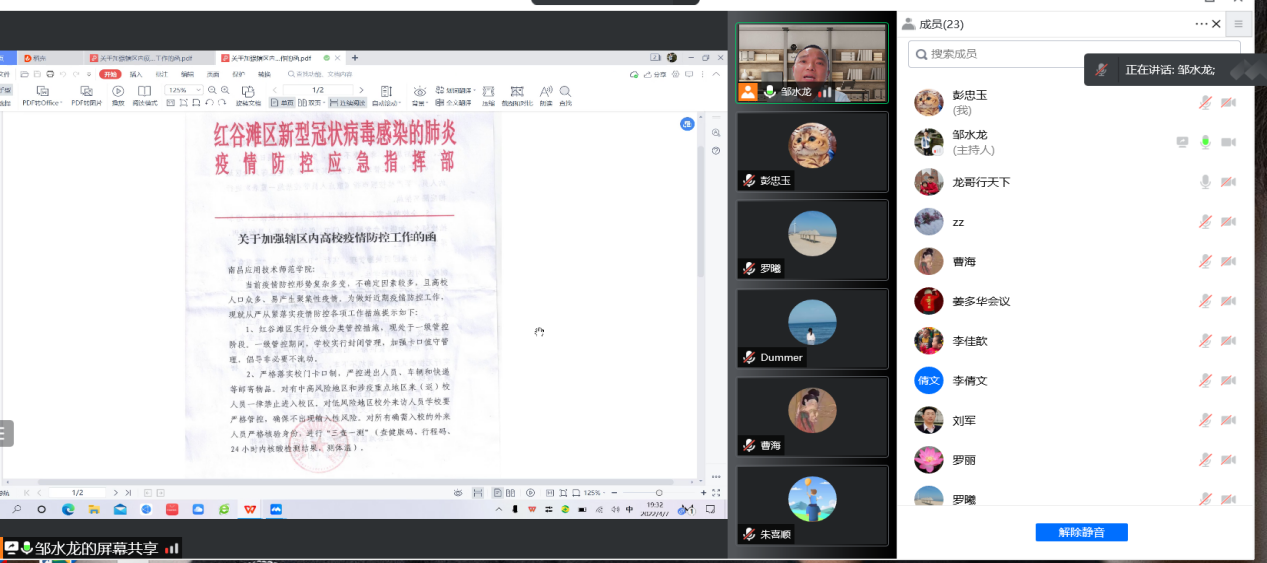 4月7日晚,beat365英国官方网站利用腾讯会议,线上召开疫情防控再部署会,学院全体教职工参加了此次会议,会议由院长邹水龙主持。
