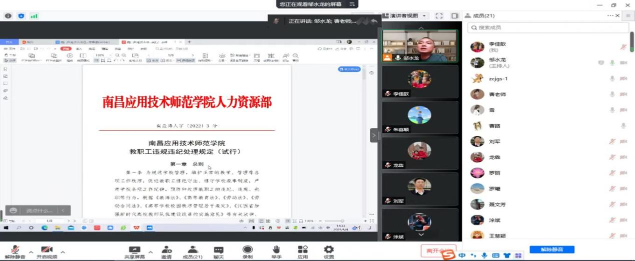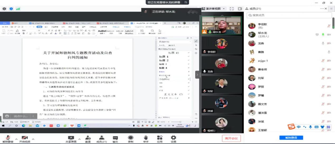 5月4日,beat365英国官方网站利用腾讯会议,线上举行师德师风专题教育活动,全体教职工参加了此次活动,活动由院长邹水龙主持。