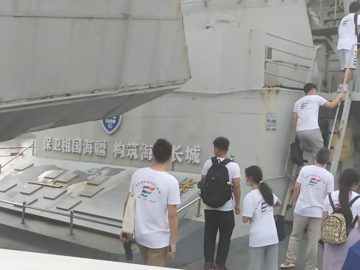 下午14时,实践小队又一起前往了南昌舰主题园。踏上连接战舰的桥梁,进入到战舰内部,“南昌舰,八一魂”,这艘战舰历经风雨,如今停在江边默默地诉说着它无数闪光的舰迹。我们通过阅读舰上的征程舰迹,共同感受这艘战舰保卫祖国万里海疆的峥嵘岁月。随后我们参观了各类舰载设施和武器装备,真切地感受和体验了海军作战部队的日常生活工作环境和状态。实践队成员们深刻感受到海军人吃苦耐劳、保卫国家的高贵品质以及南昌舰官兵们“爱舰、和谐、精武、奉献”精神!