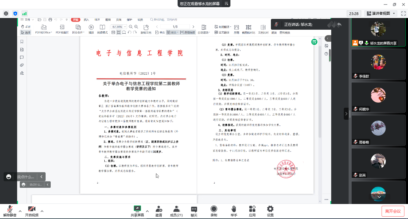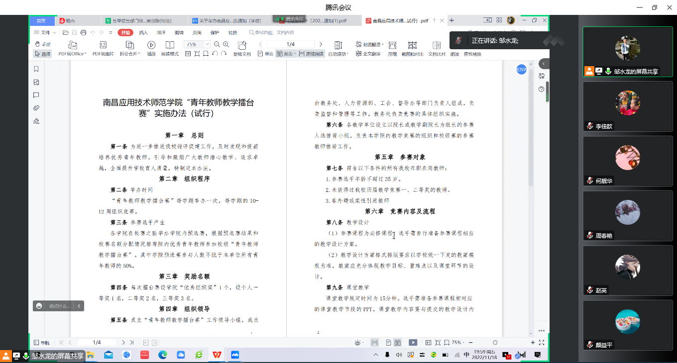 11月18日,beat365英国官方网站利用腾讯会议,线上召开2022年度青年教师教学竞赛推进会,教务管理人员、全体专任教师参加了此次会议,会议由院长邹水龙主持。
